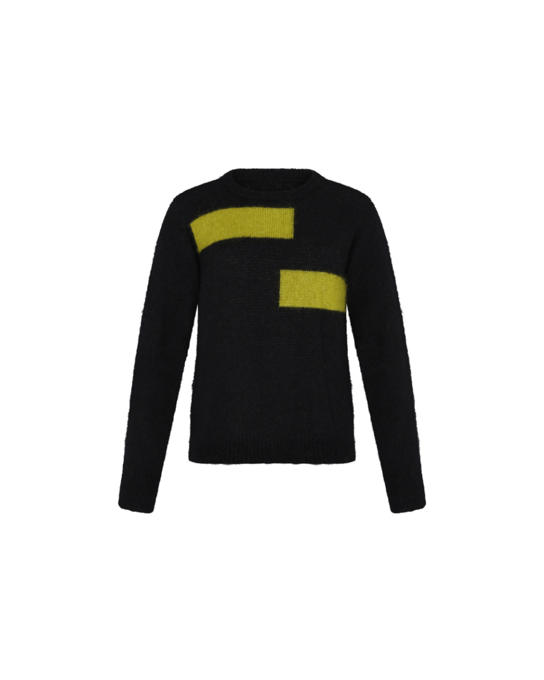 Black knit sweater with round neckline, long sleeves, and white geometric details at the chest.