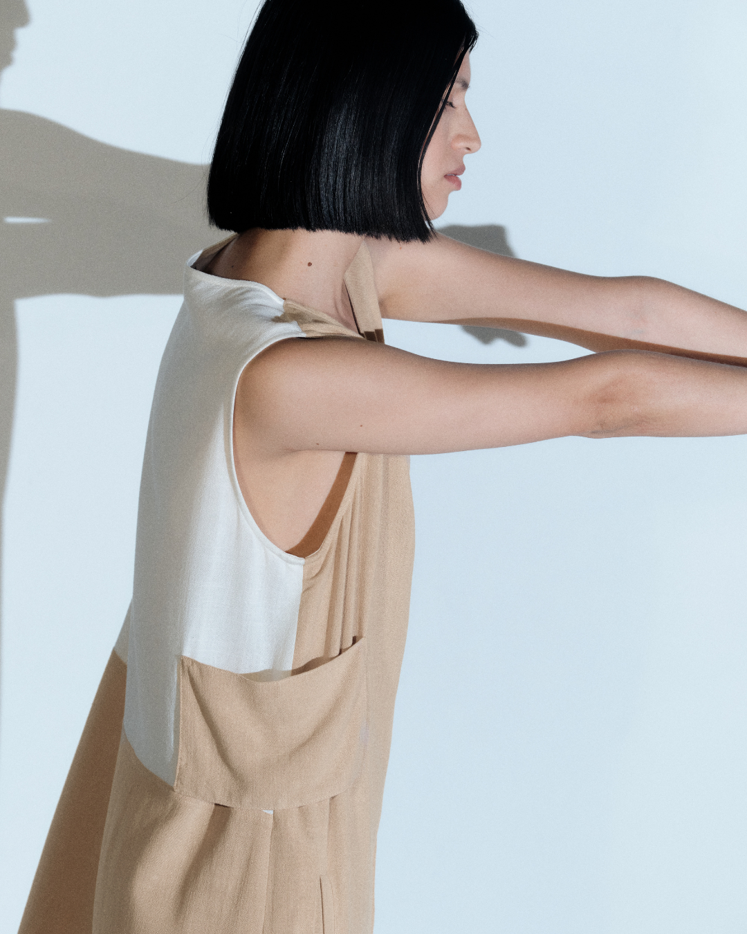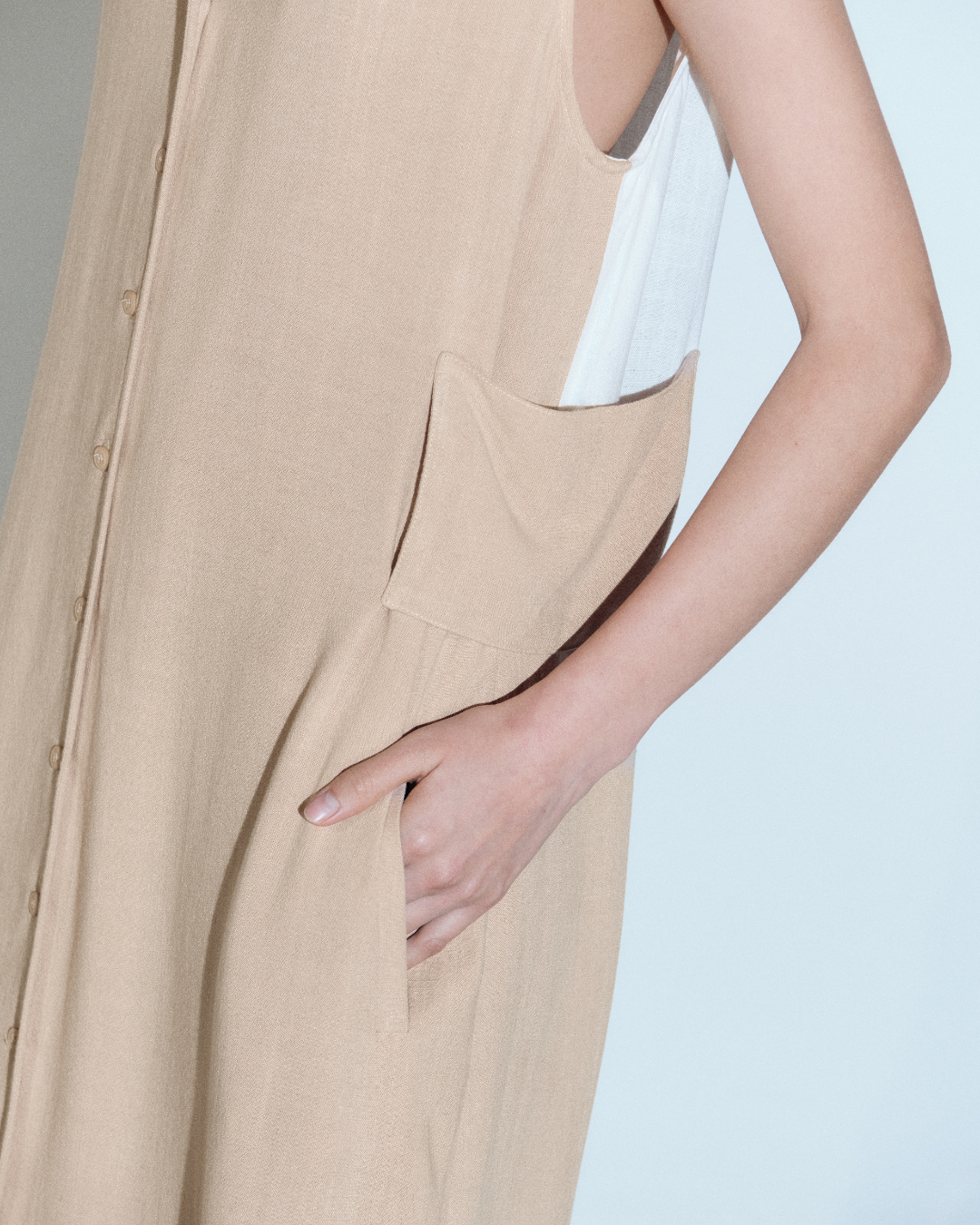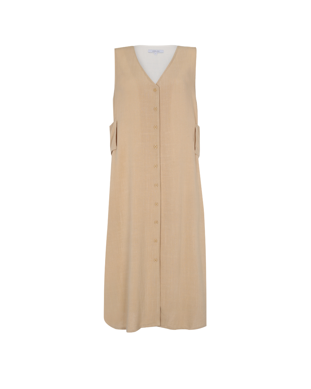 V neck button down midi dress with side patches and contrast color back.