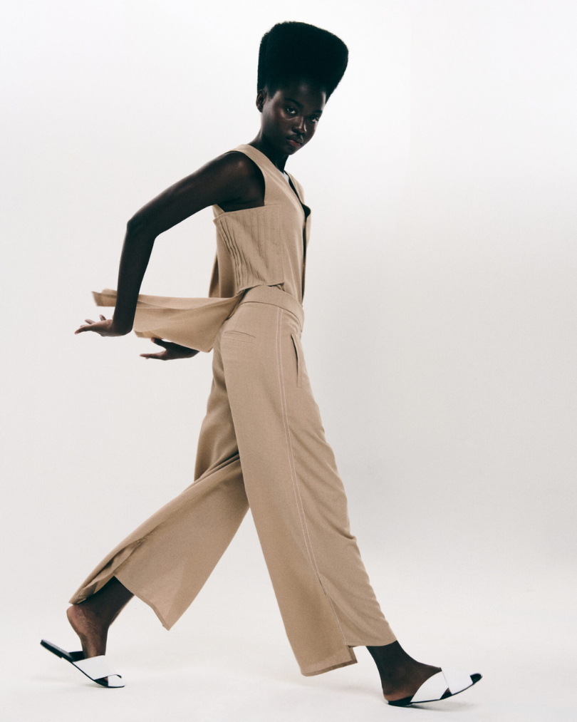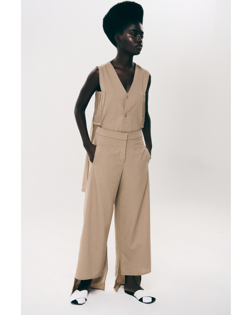 Detail of patches with pleating details on the sides that join front and back till the high waist and leave the bottom open