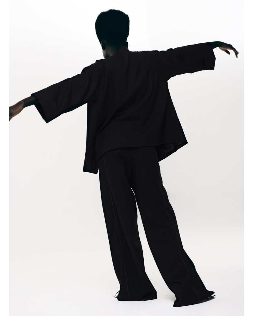 High waist pants, pockets on the front side, long medium wide legs. Back-stitching detail on the front side and on the back side.