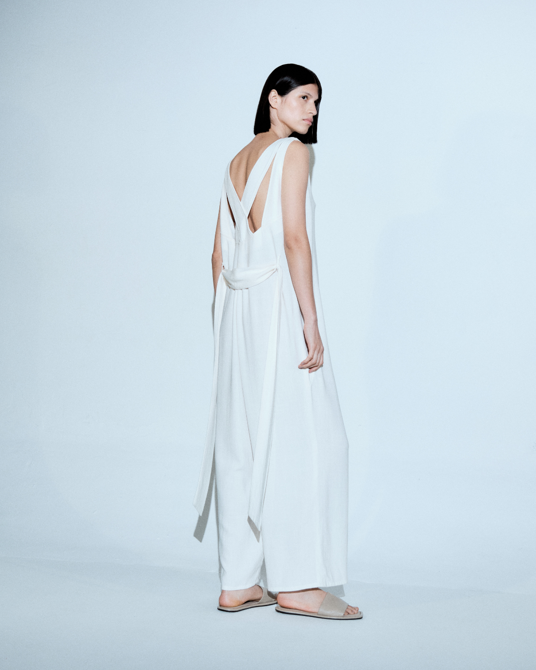 Sleeveless button-down jumpsuit with criss-cross back detail. Removable waistband.
