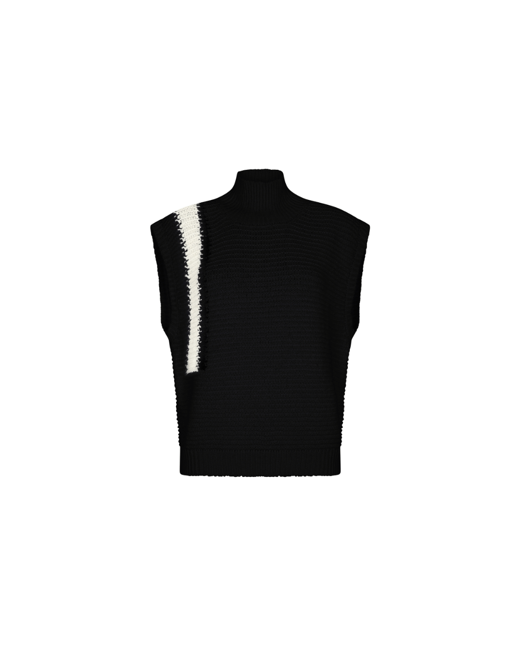 Black knitted vest with high neck and white stripe detail on the side. Sleeveless with textured knit finish.
