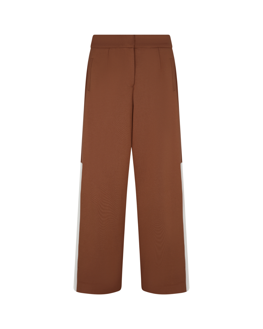 Pants with straight cut and vertical ivory side stripe. Cropped length and clean tailored look.